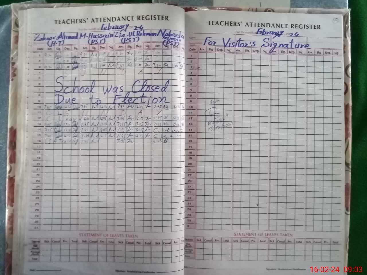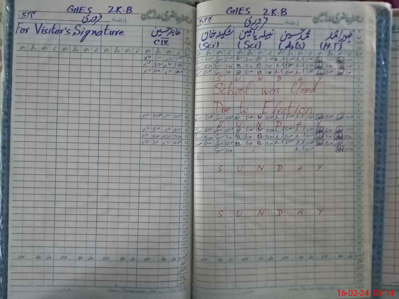| Remarks (Use Separate Page if Required): As per afternoon attendence register PST Nabeela and Abid Husain class 4 found absent on 15 Feb 2024 afternoon time | |||||