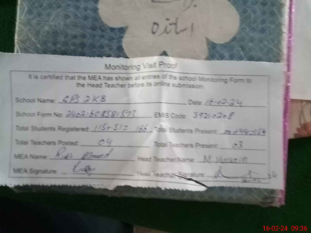 | Attendance Register | Head Teacher | MEA with School | Visit Proof |