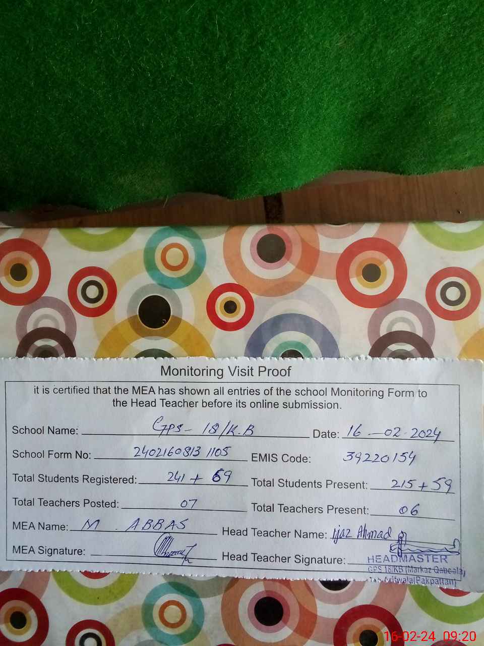 | EMIS Code: 39220154 | Name of School: GPS CHAK NO. 18 KB | |||