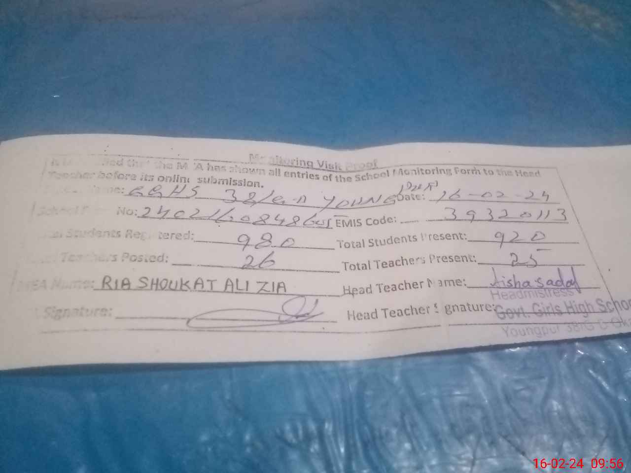 | Monitoring Date: 16-02-2024 | Start Time: 16-02-2024 08:48 AM | End Time: 16-02-2024 09:57 AM | Name of MEA: SH**** AL**** ZI**** (R**** | |
