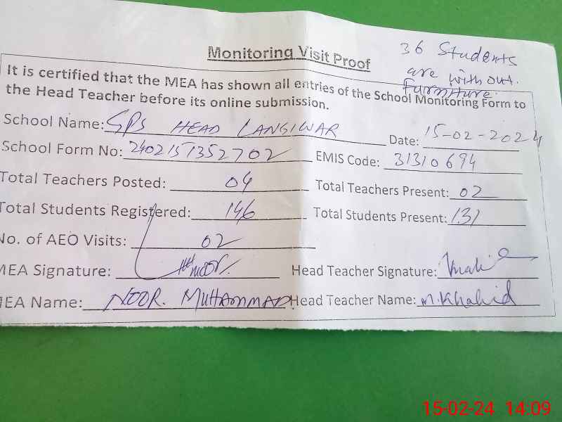| EMIS Code: 31310694 | Name of School: GPS HEAD LANJI WAR | |||