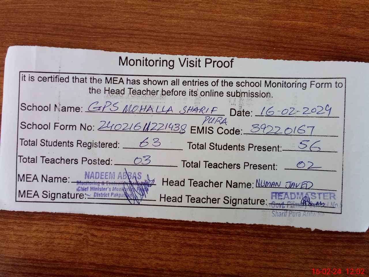 | EMIS Code: 39220167 | Name of School: GPS MOHALLA SHARIF PURA | |||
