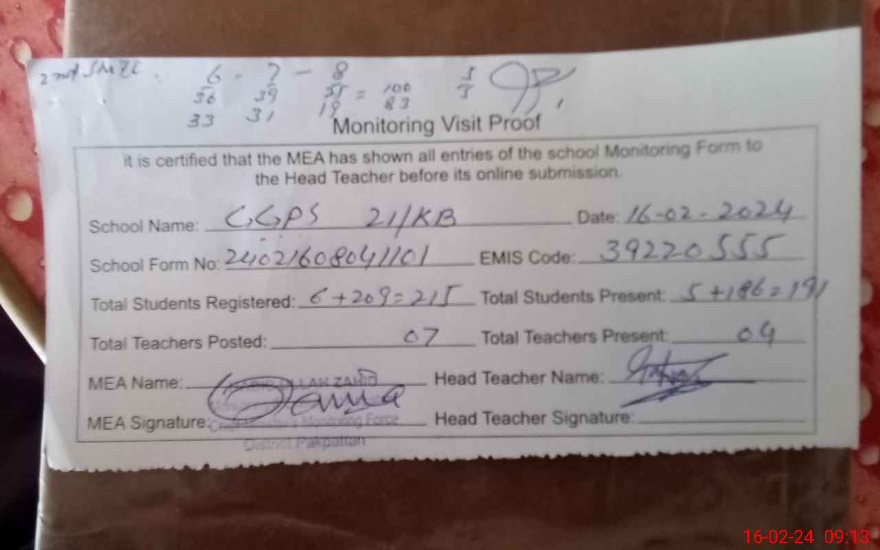 | Certified that this School was Inspected by the Undersigned MEA/DMO Today and the Information Stated Above is as Per Record. | |||||