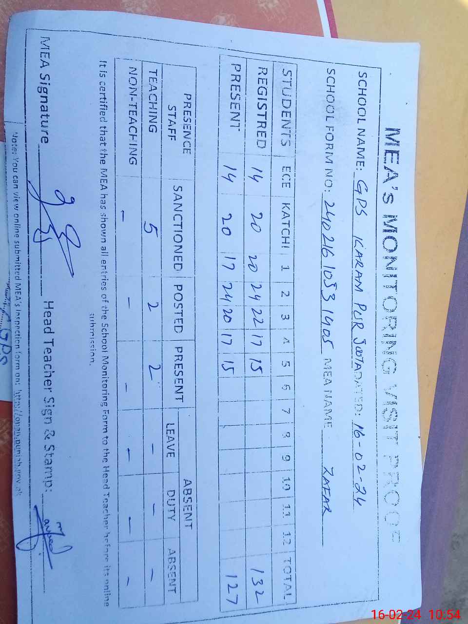 | Attendance Register | Head Teacher | MEA with School | Visit Proof |