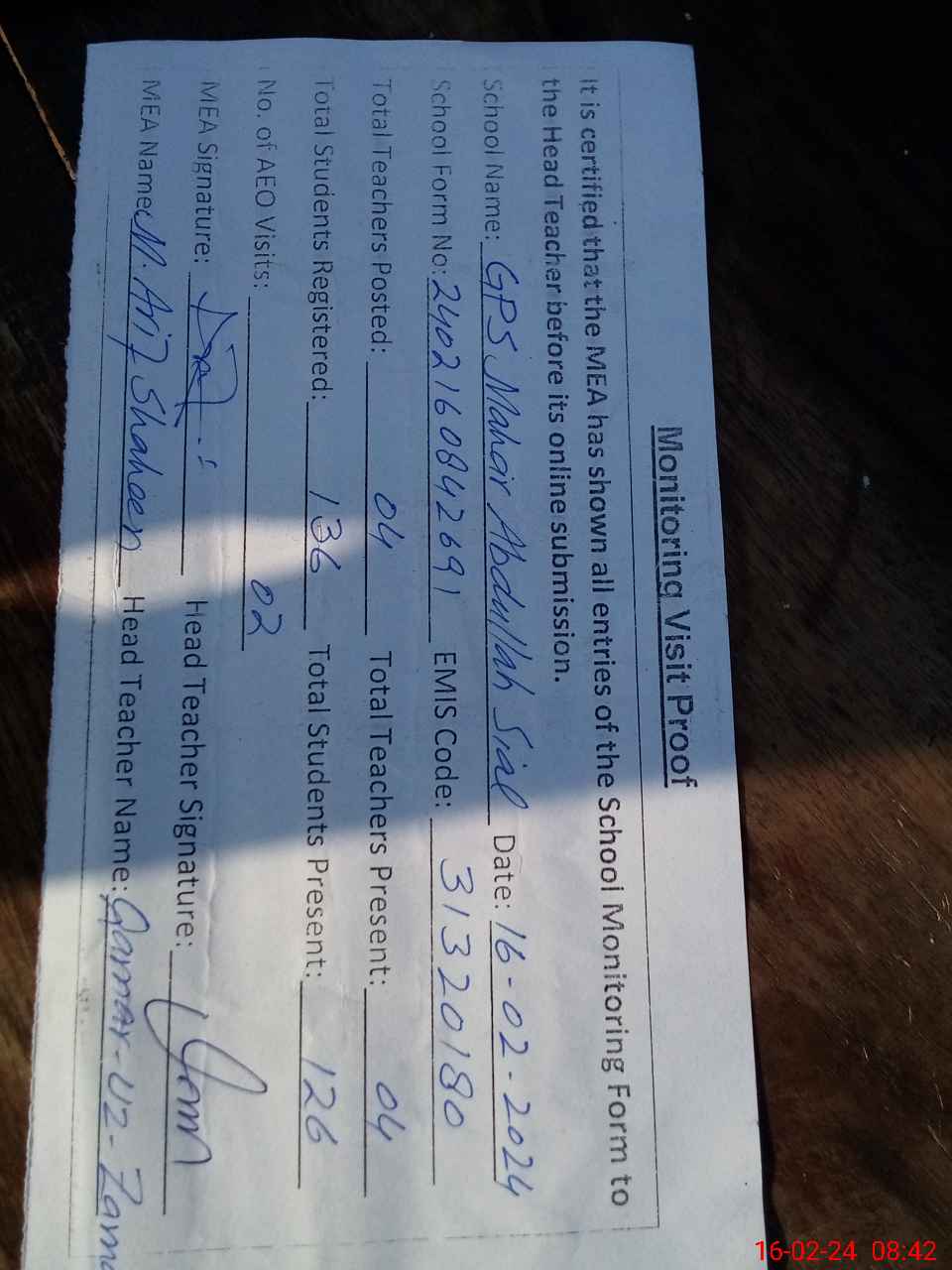 | Attendance Register | Head Teacher | MEA with School | Visit Proof |
