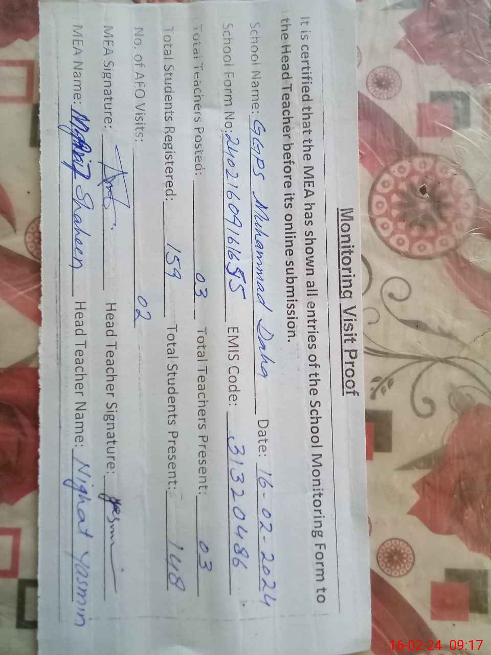 | Attendance Register | Head Teacher | MEA with School | Visit Proof |