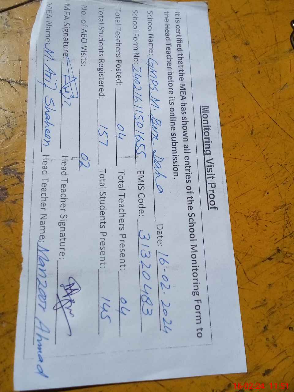 | Attendance Register | Head Teacher | MEA with School | Visit Proof |