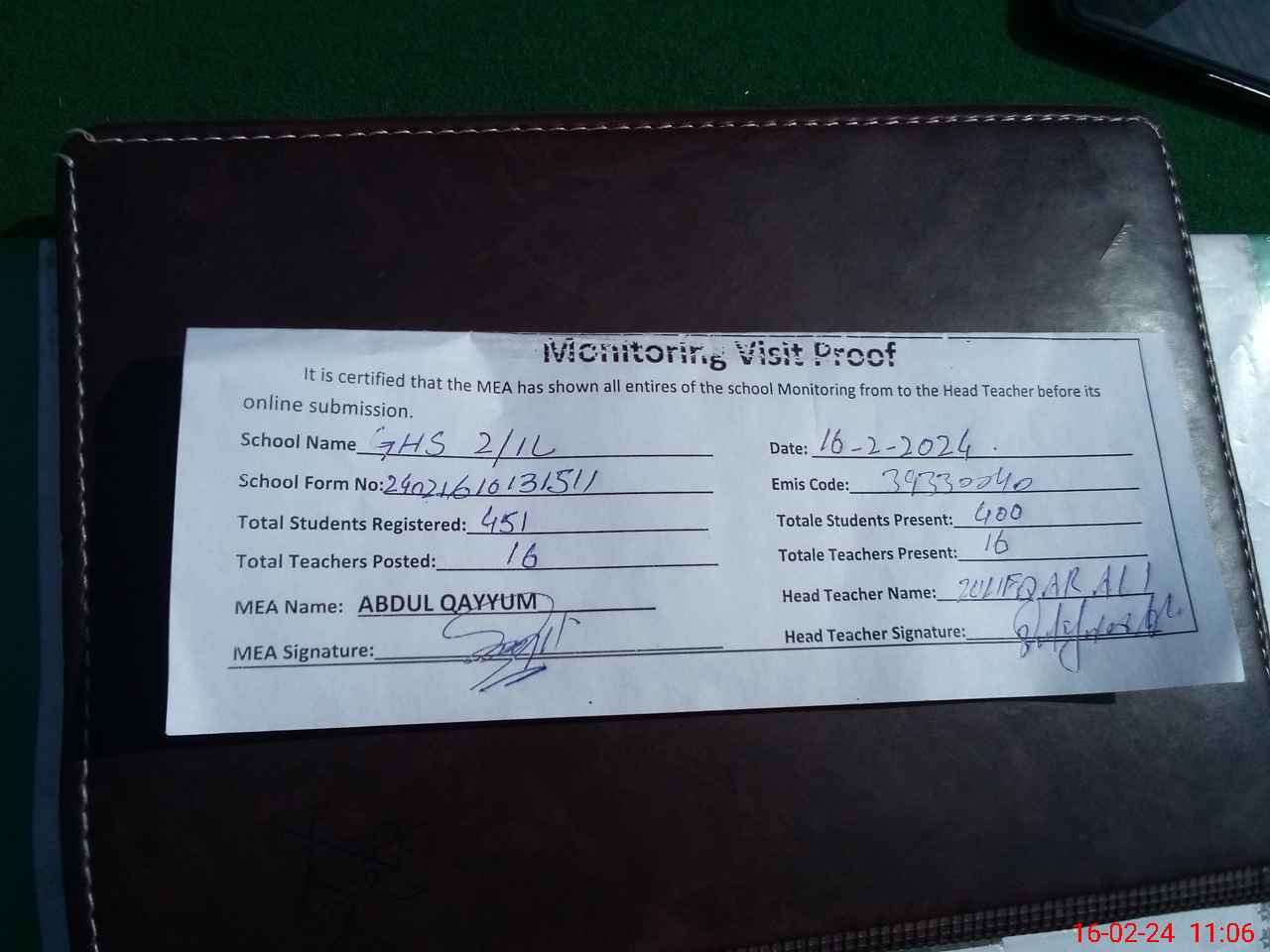 | Certified that this School was Inspected by the Undersigned MEA/DMO Today and the Information Stated Above is as Per Record. | |||||