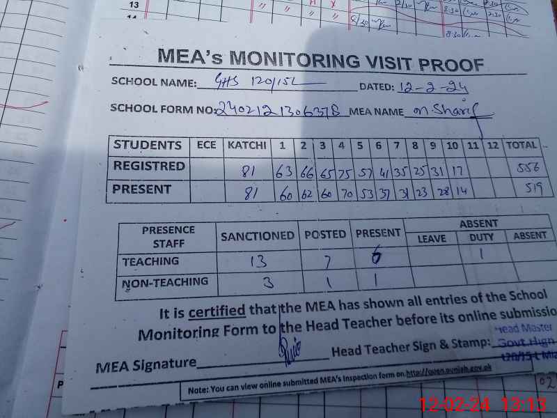 | Attendance Register | Head Teacher | MEA with School | Visit Proof |