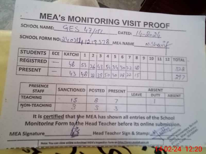 | Attendance Register | Head Teacher | MEA with School | Visit Proof |
