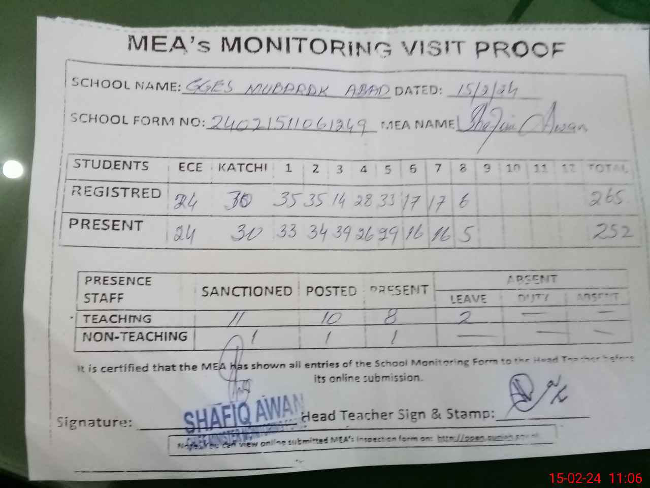 | Attendance Register | Head Teacher | MEA with School | Visit Proof |