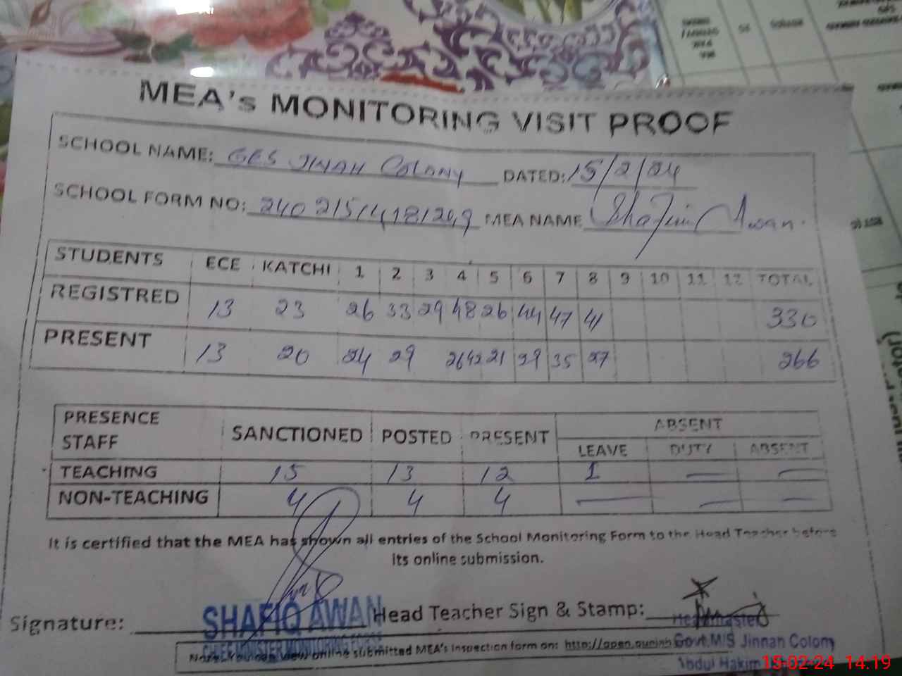 | EMIS Code: 36410069 | Name of School: GHS JINNAH COLONY, ABDUL HAKIM | |||