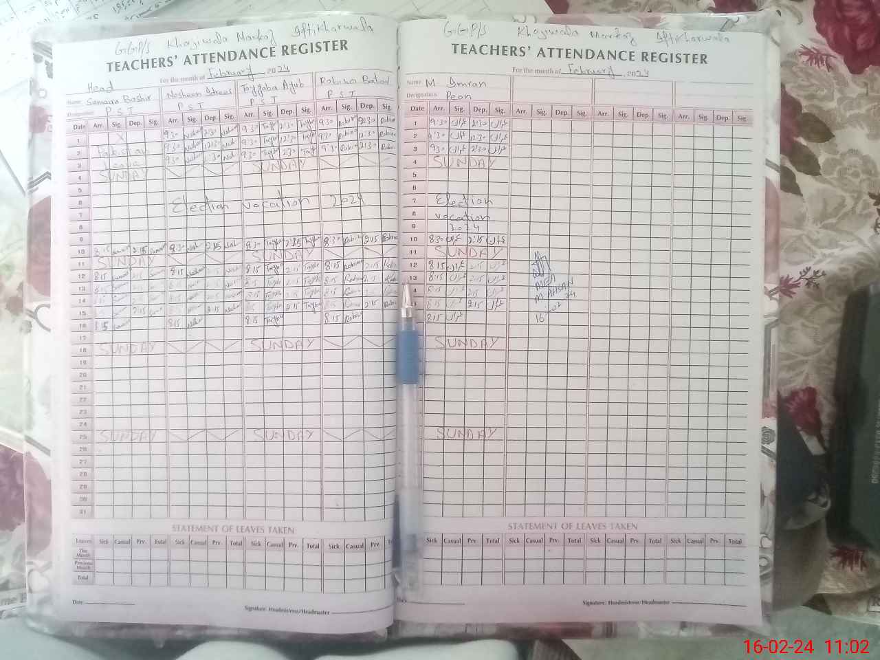 | CNIC | Full Name | Designation | R/C | Absence During Last Calender Month |