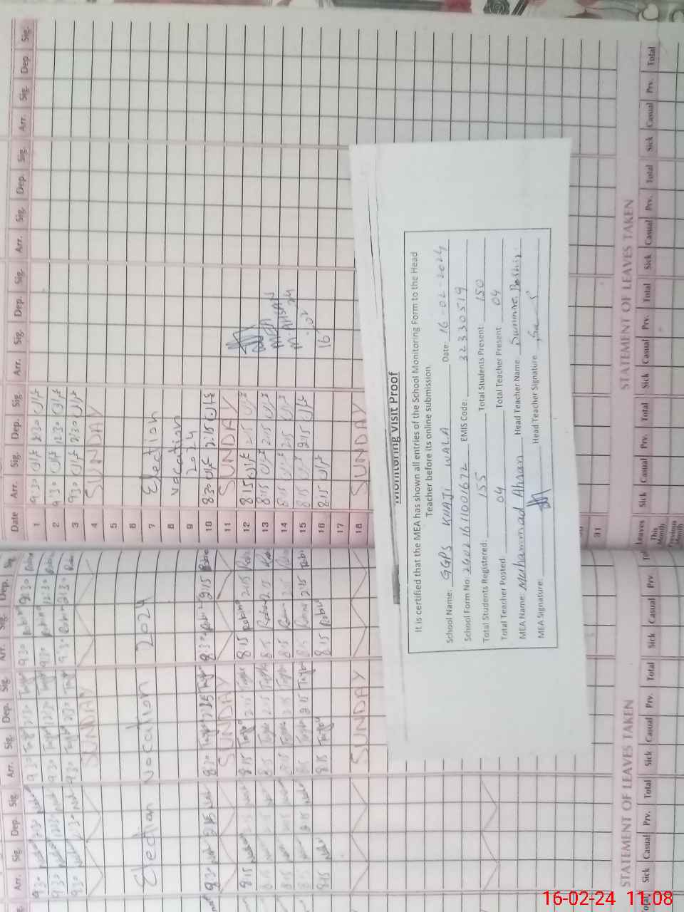 | Attendance Register | Head Teacher | MEA with School | Visit Proof |