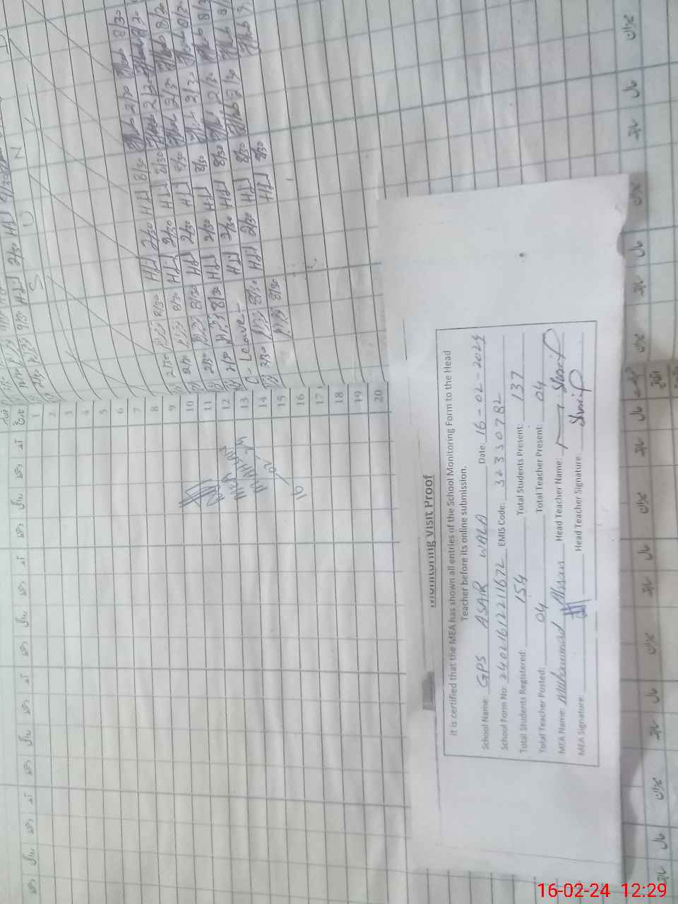 | Attendance Register | Head Teacher | MEA with School | Visit Proof |
