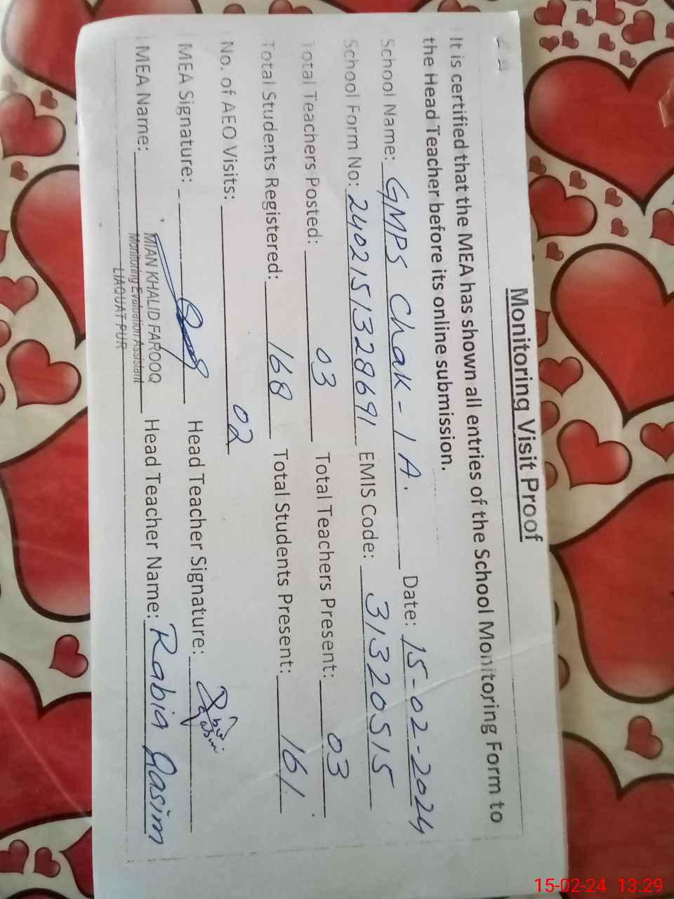 | Attendance Register | Head Teacher | MEA with School | Visit Proof |