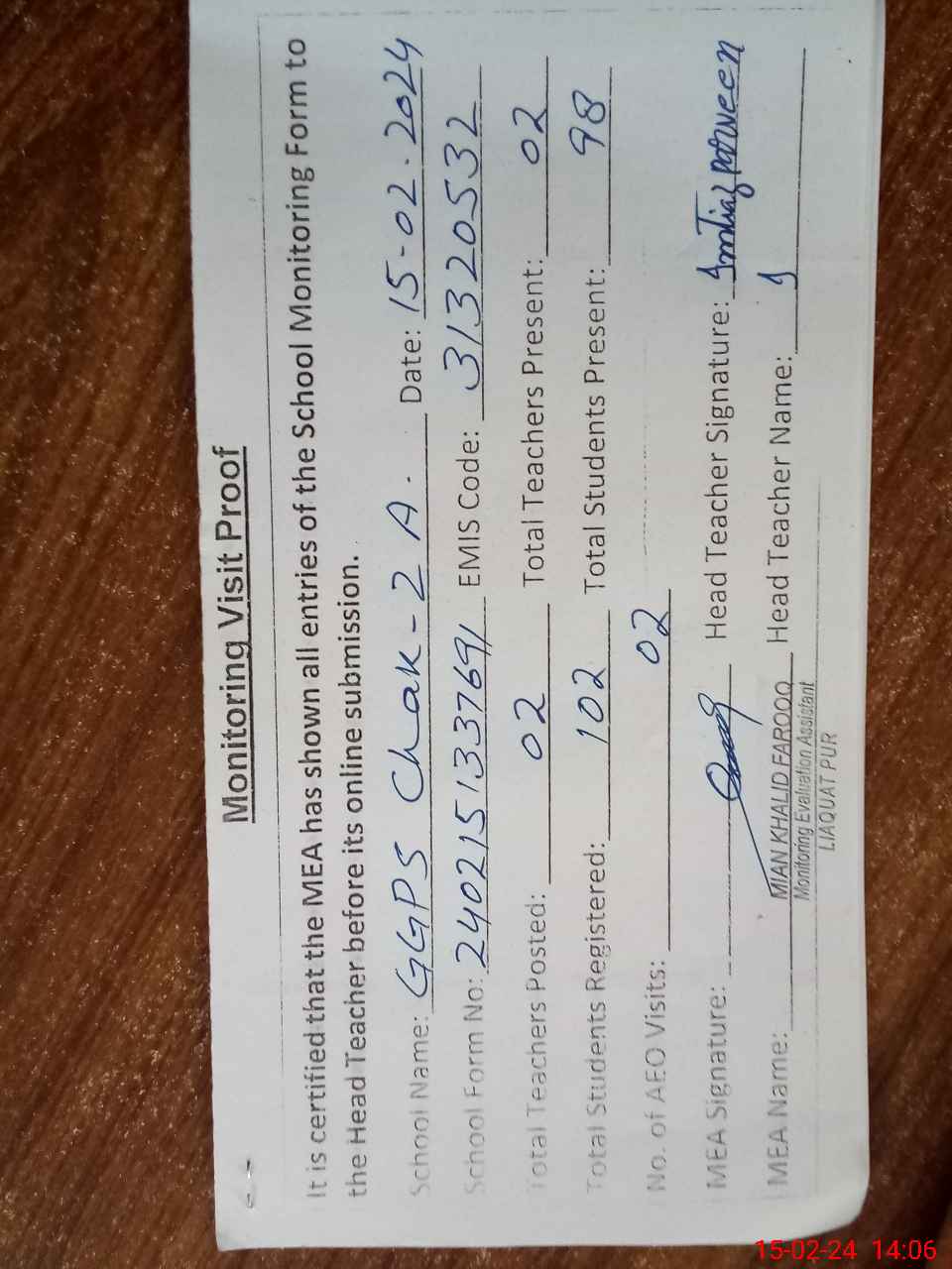 | EMIS Code: 31320532 | Name of School: GGPS CHAK NO.2/A | |||