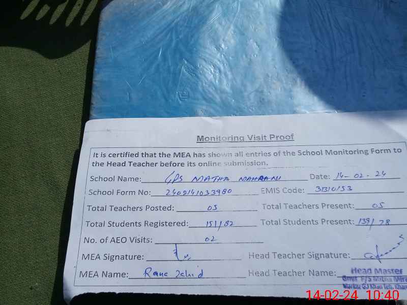 | EMIS Code: 31310153 | Name of School: GPS MITHA MERANI (After Noon) | |||