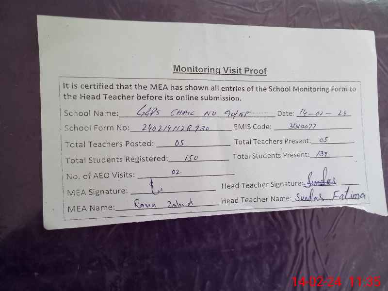 | EMIS Code: 31310077 | Name of School: GGPS CHAK NO. 90/NP | |||