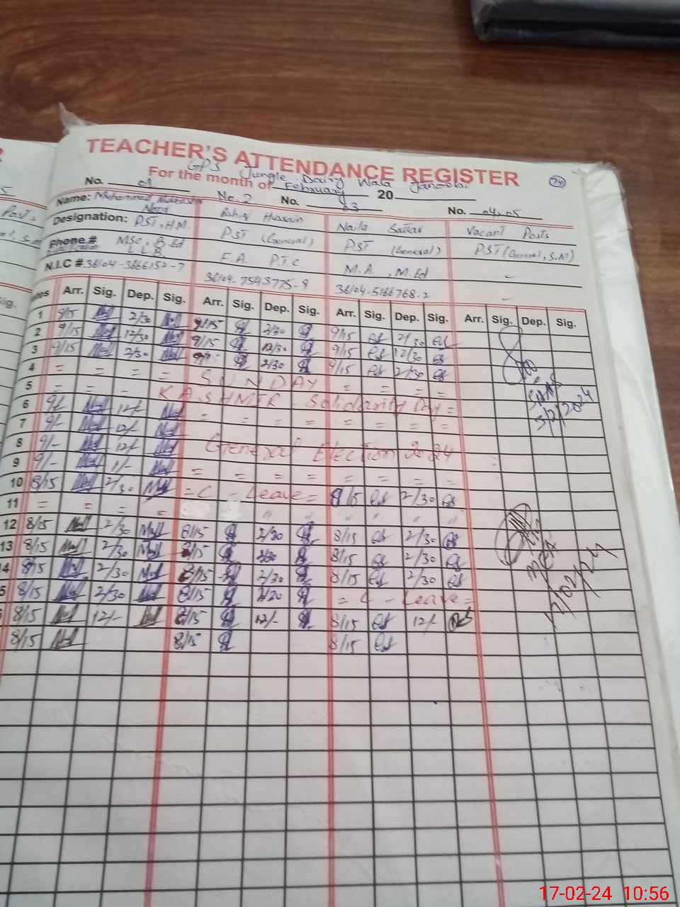 | CNIC | Full Name | Designation | R/C | Absence During Last Calender Month |