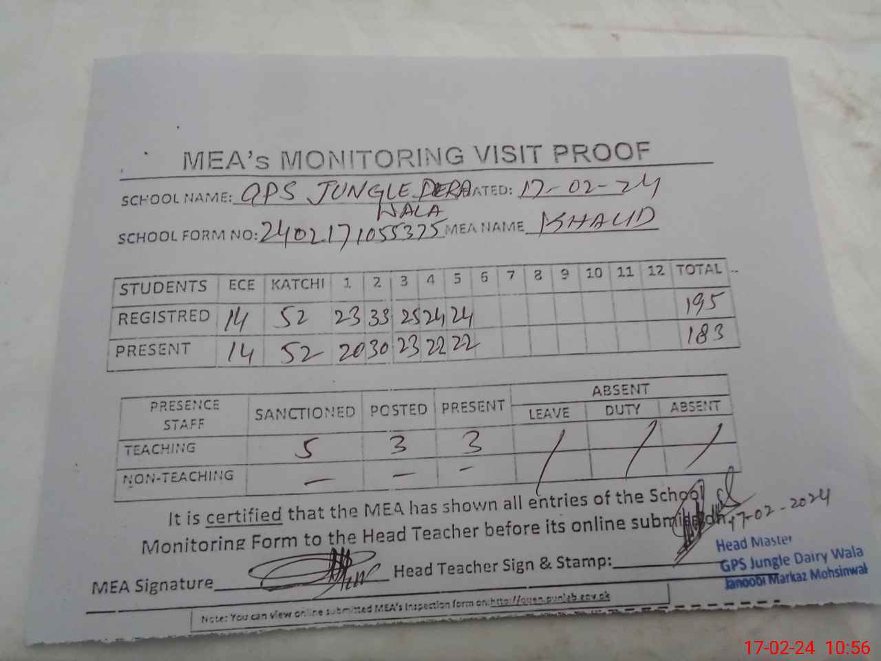 | Attendance Register | Head Teacher | MEA with School | Visit Proof |