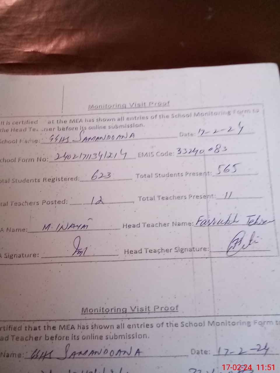 | Attendance Register | Head Teacher | MEA with School | Visit Proof |