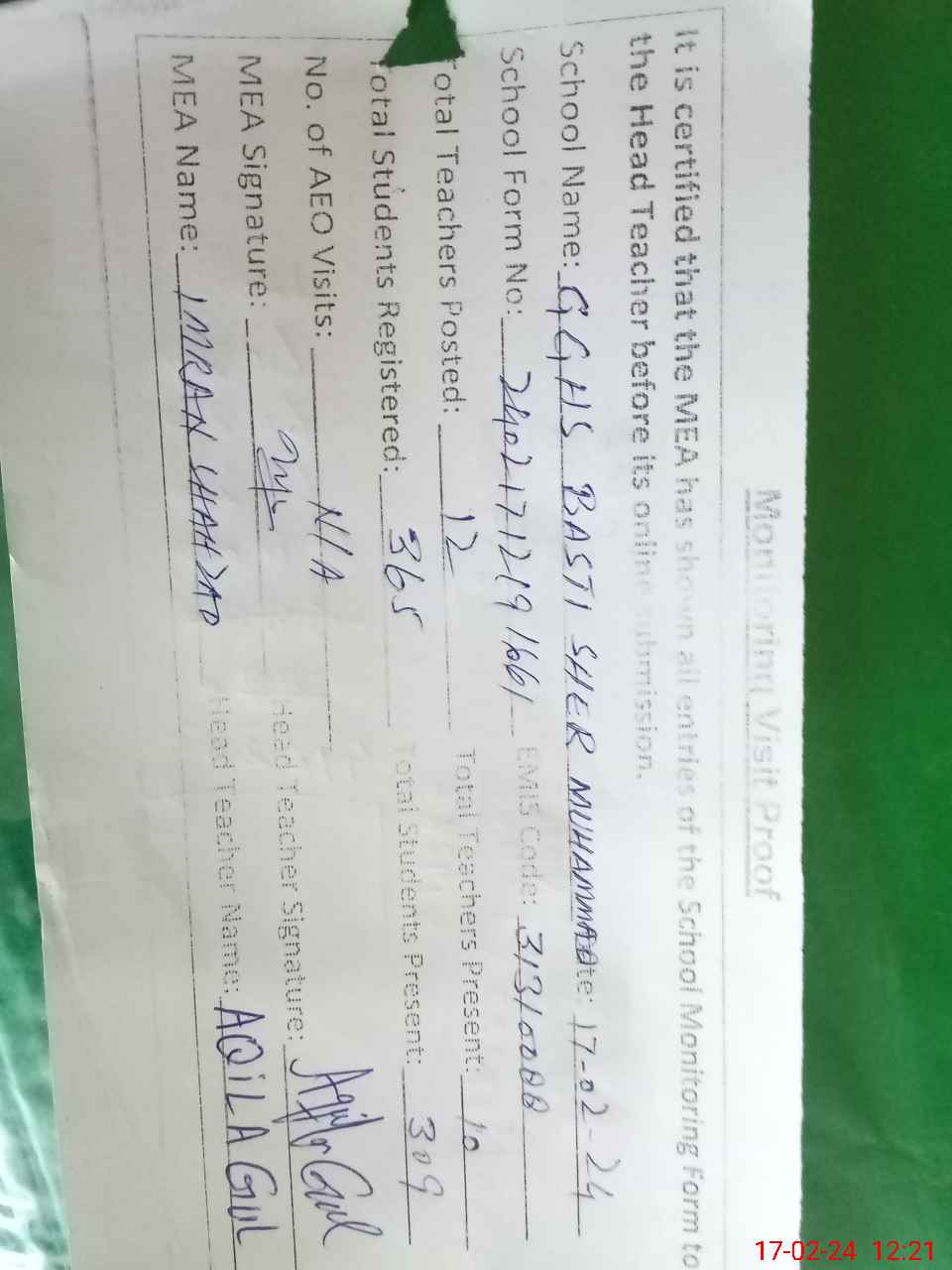 | EMIS Code: 31310088 | Name of School: GGHS BASTI SHAIR MUHAMMAD | |||