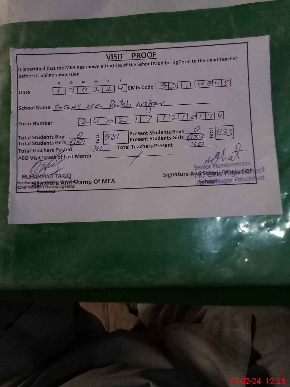 | EMIS Code: 33110345 | Name of School: GGHS MC PARTAB NAGAR FAISALABAD | |||