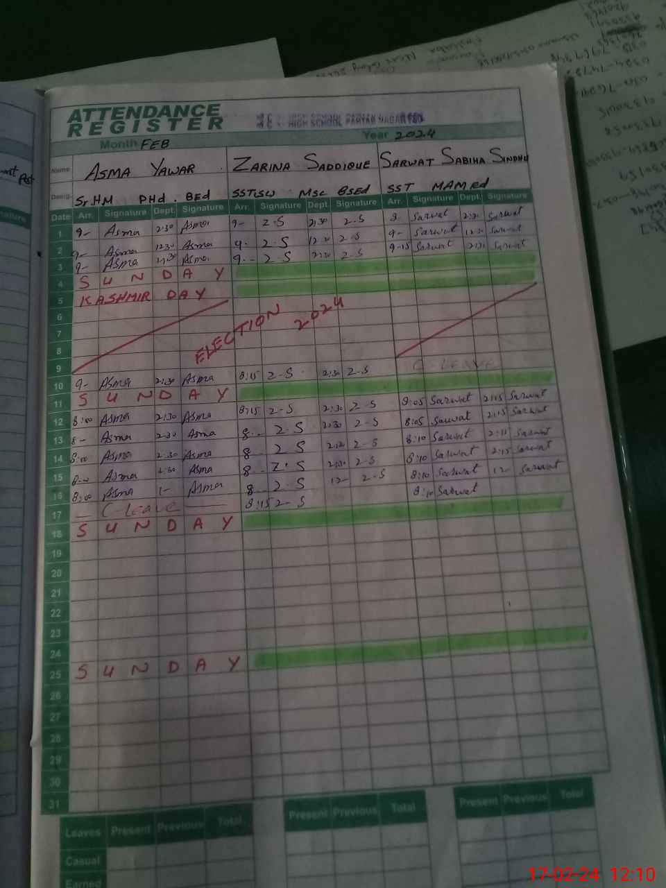 | CNIC | Full Name | Designation | R/C | Absence During Last Calender Month |