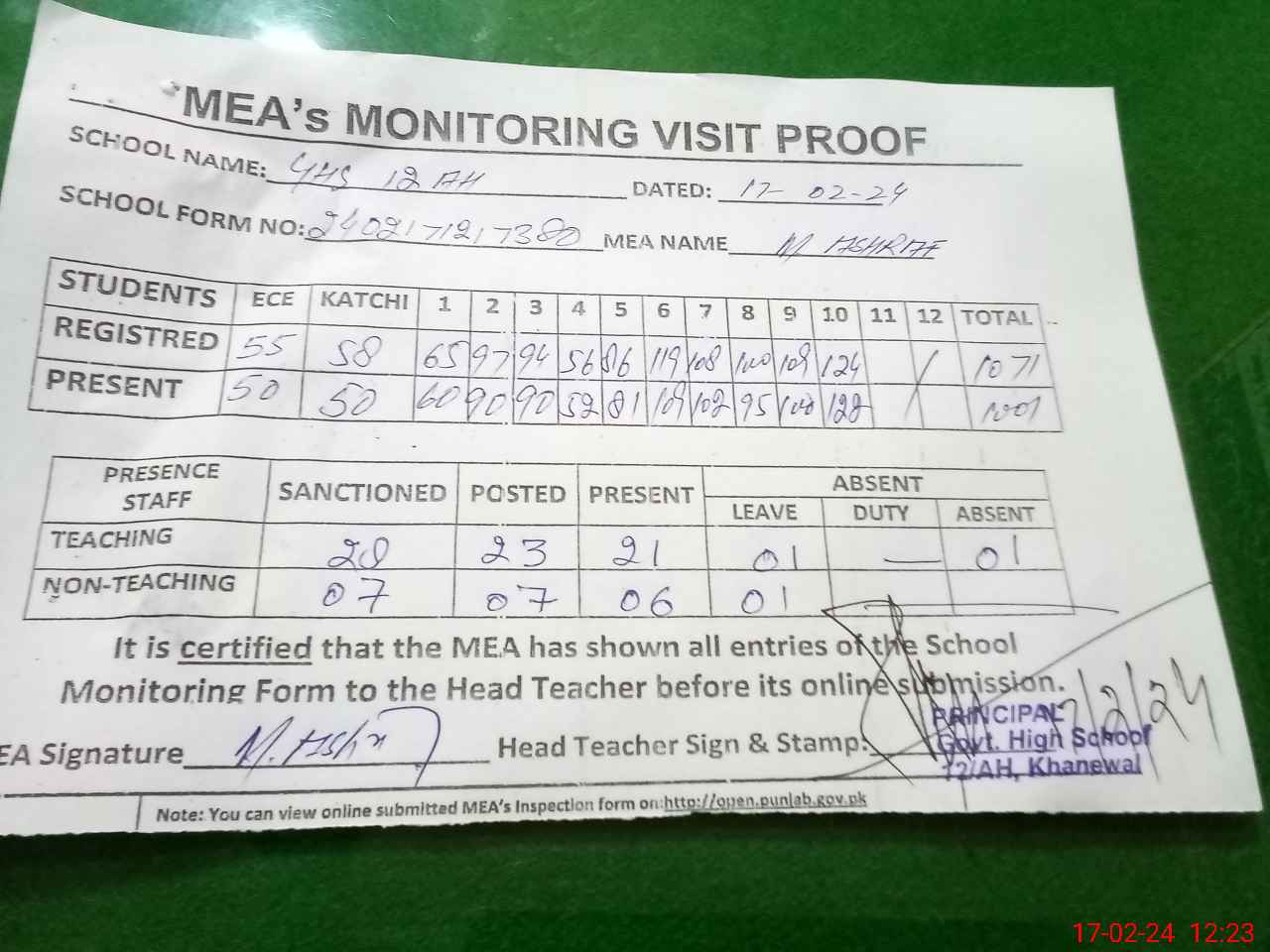 | EMIS Code: 36420006 | Name of School: GHS 12/AH, KHANEWAL | |||