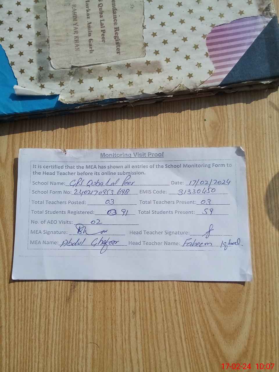 | Attendance Register | Head Teacher | MEA with School | Visit Proof |