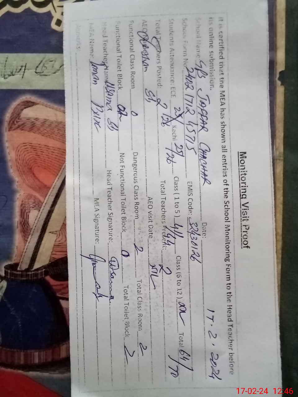 | Attendance Register | Head Teacher | MEA with School | Visit Proof |