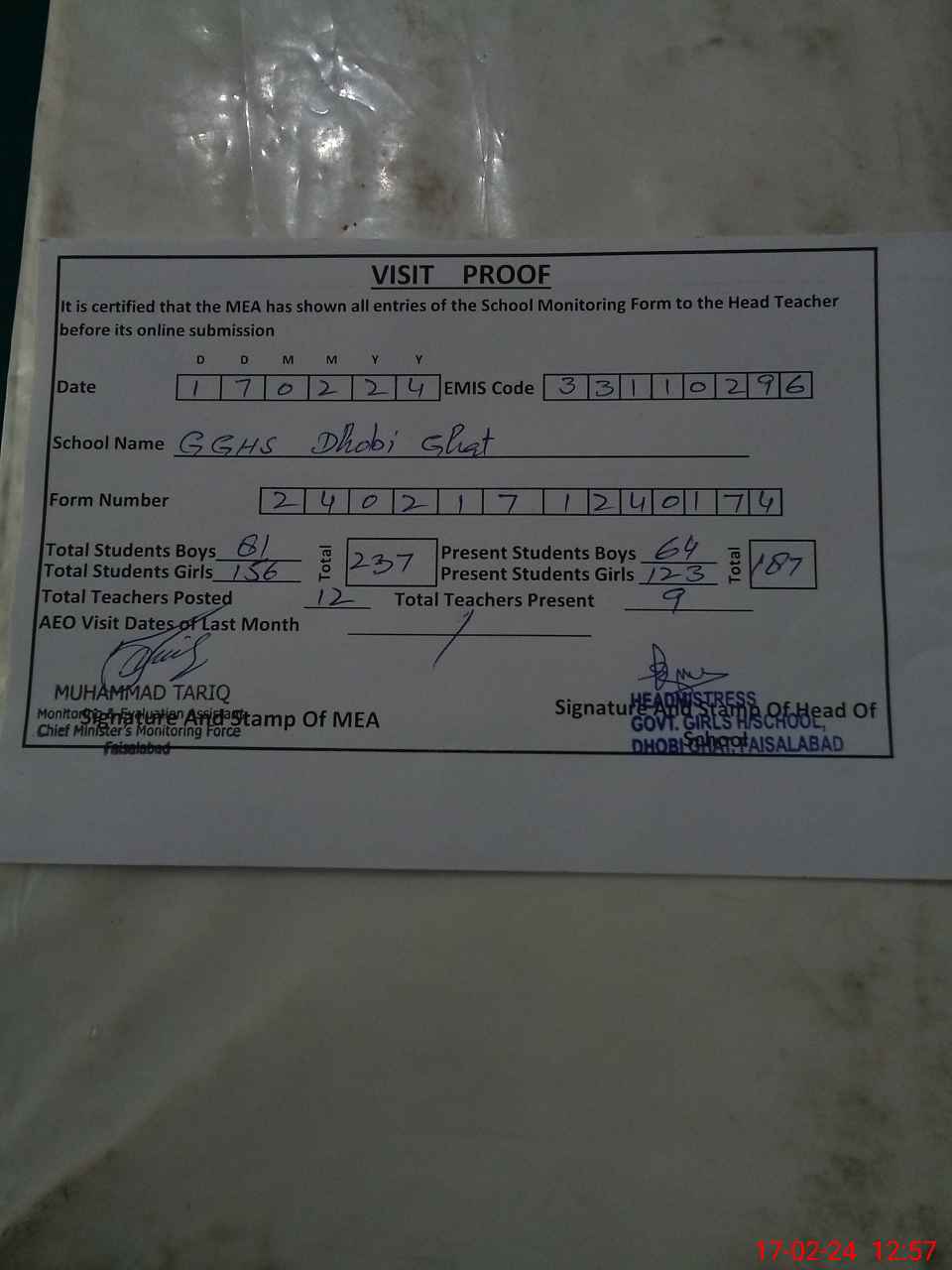 | EMIS Code: 33110296 | Name of School: GGHS DHOBI GHATT | |||