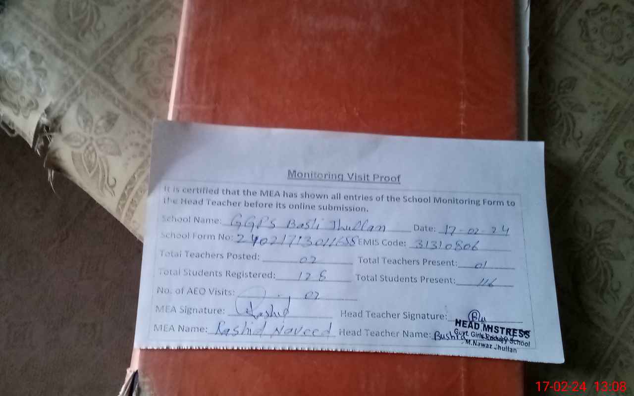 | Certified that this School was Inspected by the Undersigned MEA/DMO Today and the Information Stated Above is as Per Record. | |||||