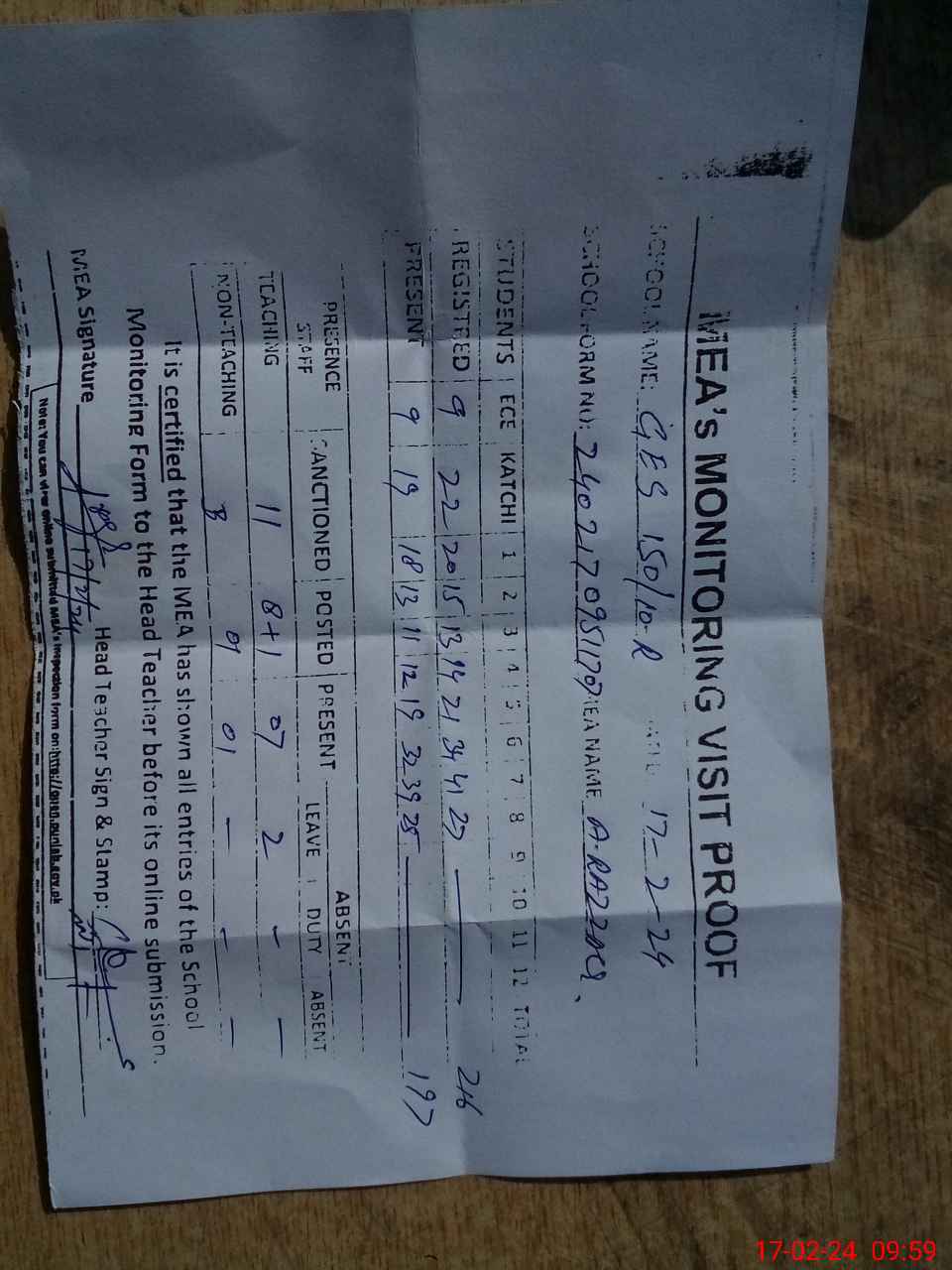 | Attendance Register | Head Teacher | MEA with School | Visit Proof |
