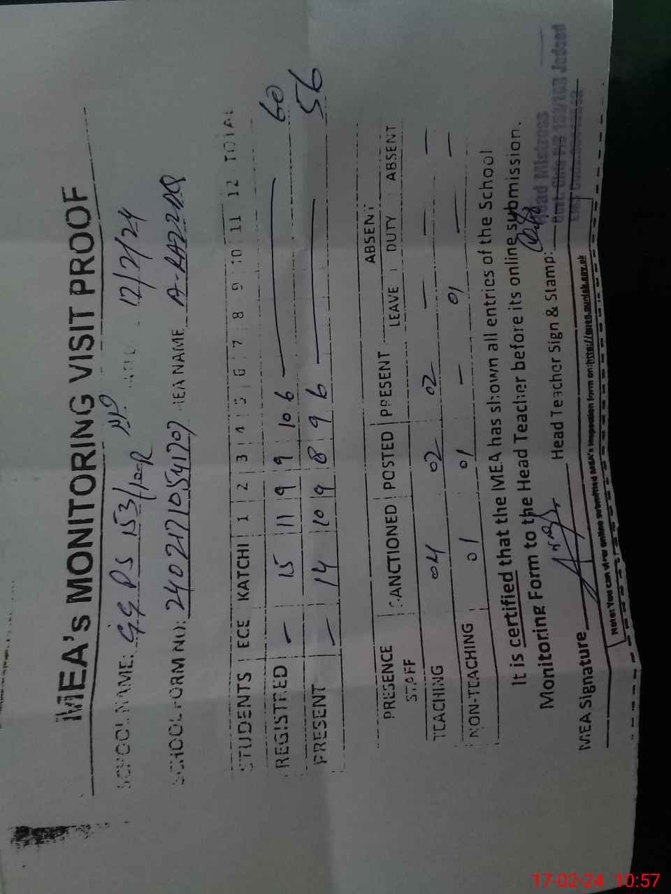 | Attendance Register | Head Teacher | MEA with School | Visit Proof |