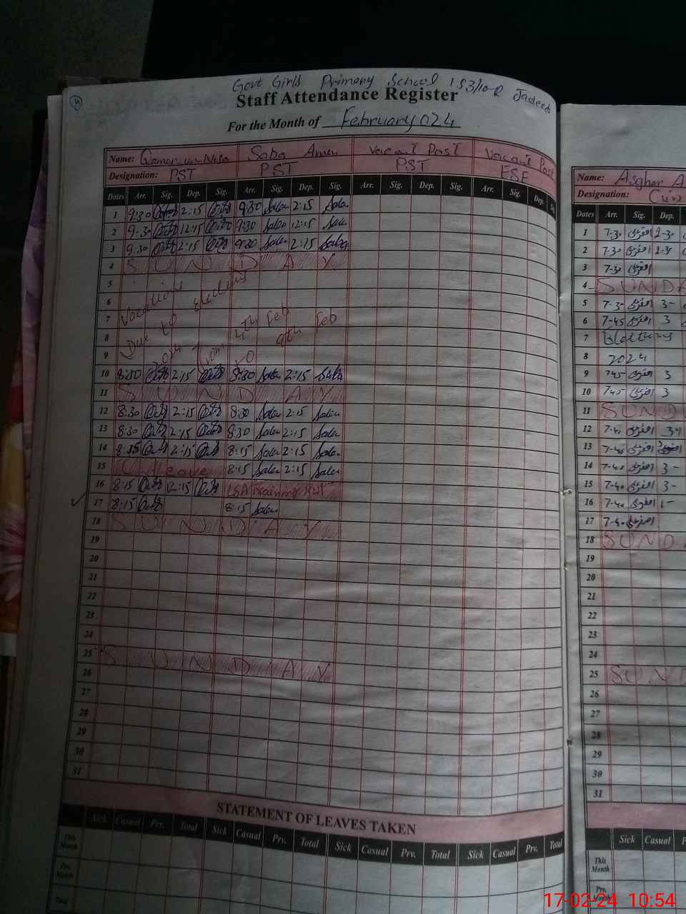 | Leave | Duty | Absent | Maternity | Medical | Ex- Pak |