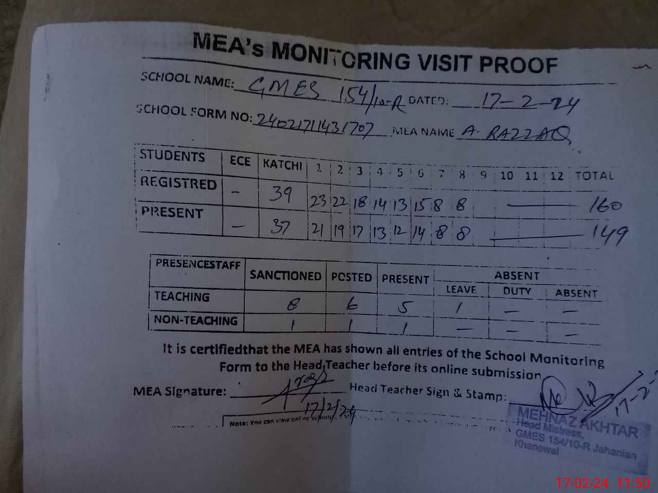 | Attendance Register | Head Teacher | MEA with School | Visit Proof |