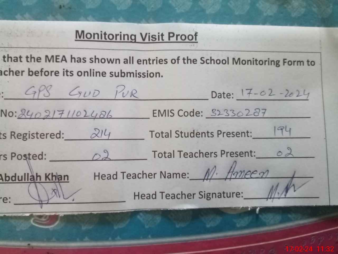 | Attendance Register | Head Teacher | MEA with School | Visit Proof |