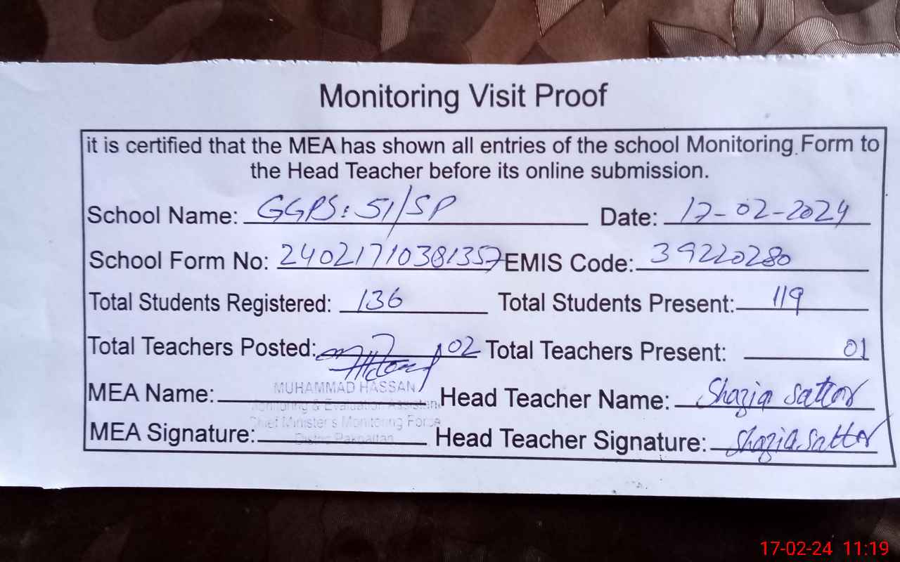 | EMIS Code: 39220280 | Name of School: GGPS 51 SP POST OFFICE JEVAN SHAH | |||
