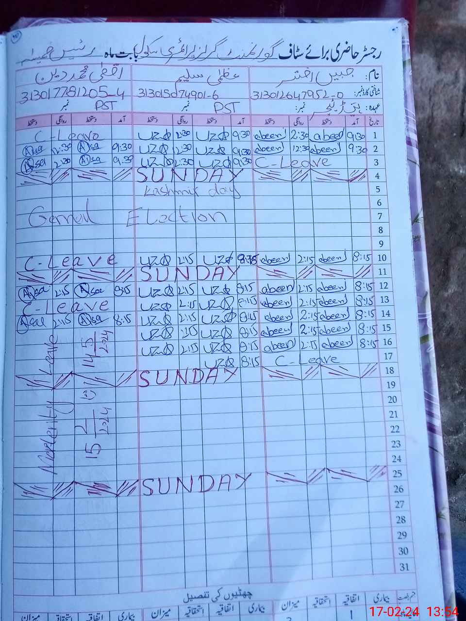 | CNIC | Full Name | Designation | R/C | Absence During Last Calender Month |