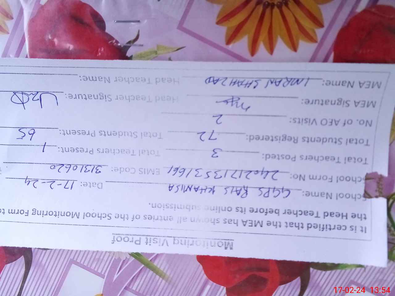 | Attendance Register | Head Teacher | MEA with School | Visit Proof |