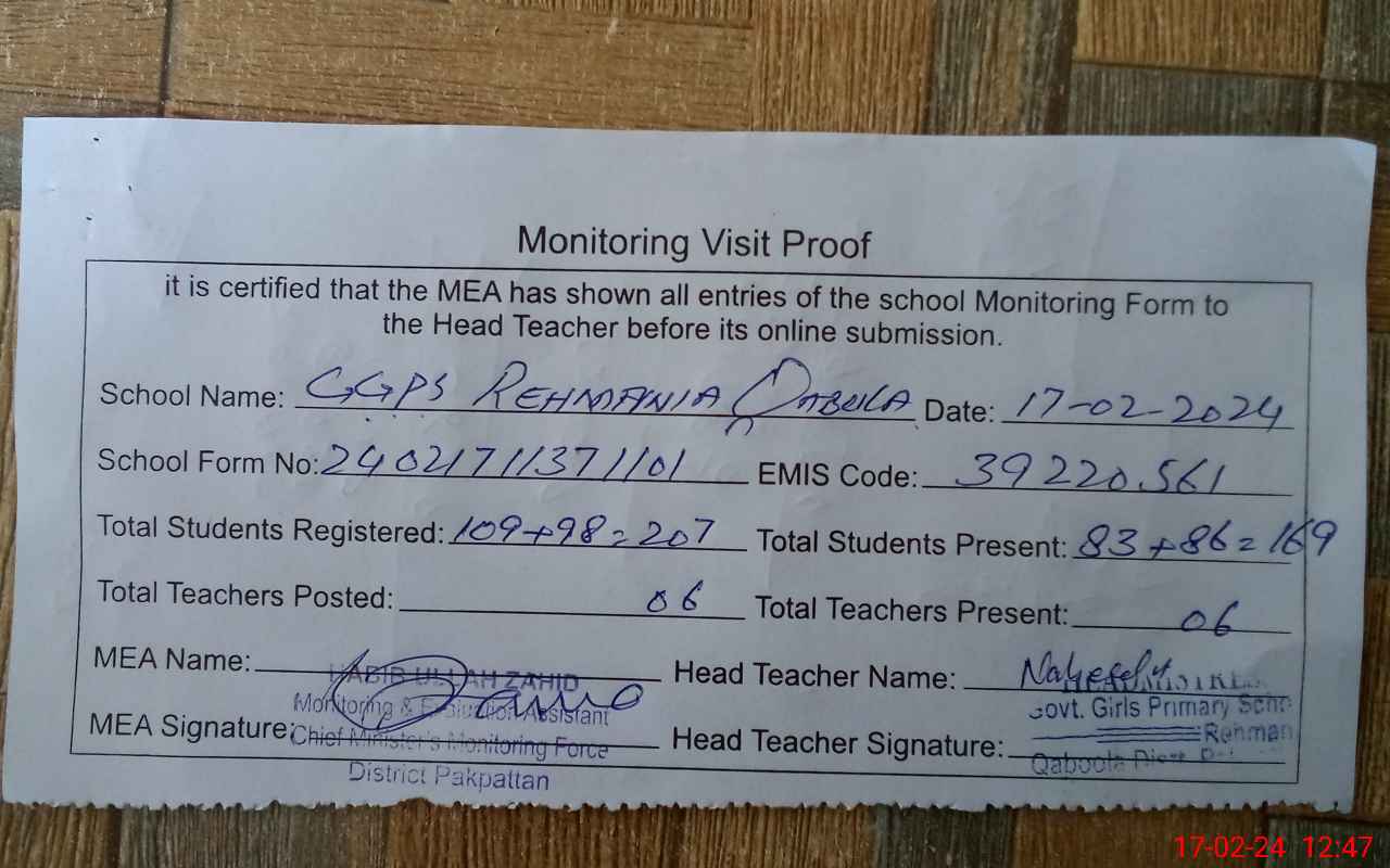 | EMIS Code: 39220561 | Name of School: GGPS REHMANIA QABOOLA | |||