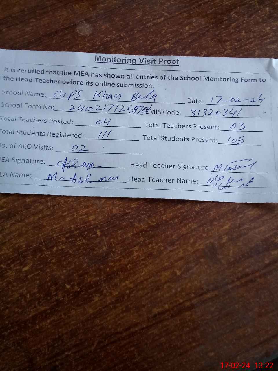 | EMIS Code: 31320341 | Name of School: GPS KHAN BELLA | |||