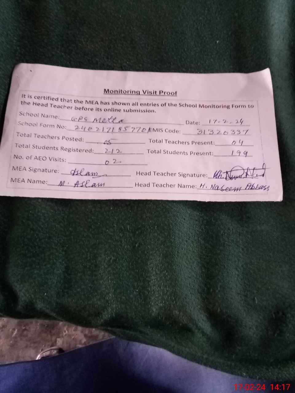 | Attendance Register | Head Teacher | MEA with School | Visit Proof |