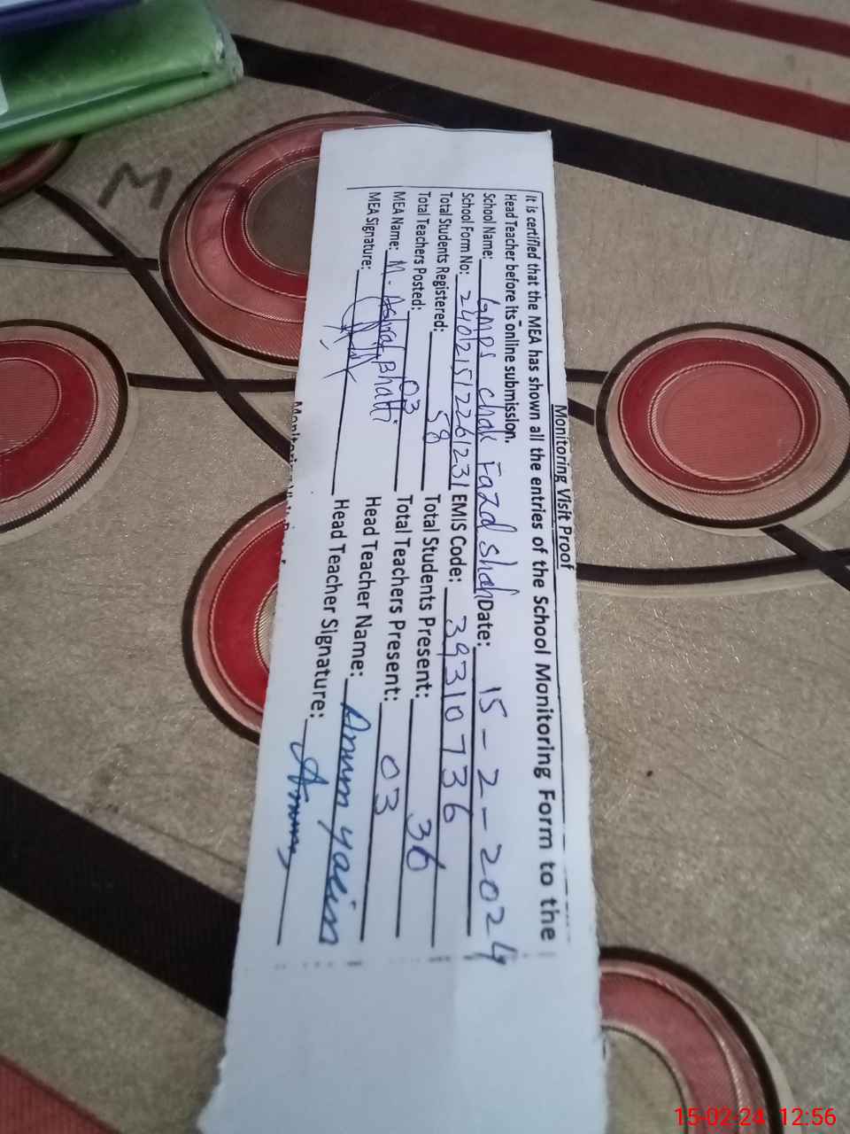| Attendance Register | Head Teacher | MEA with School | Visit Proof |
