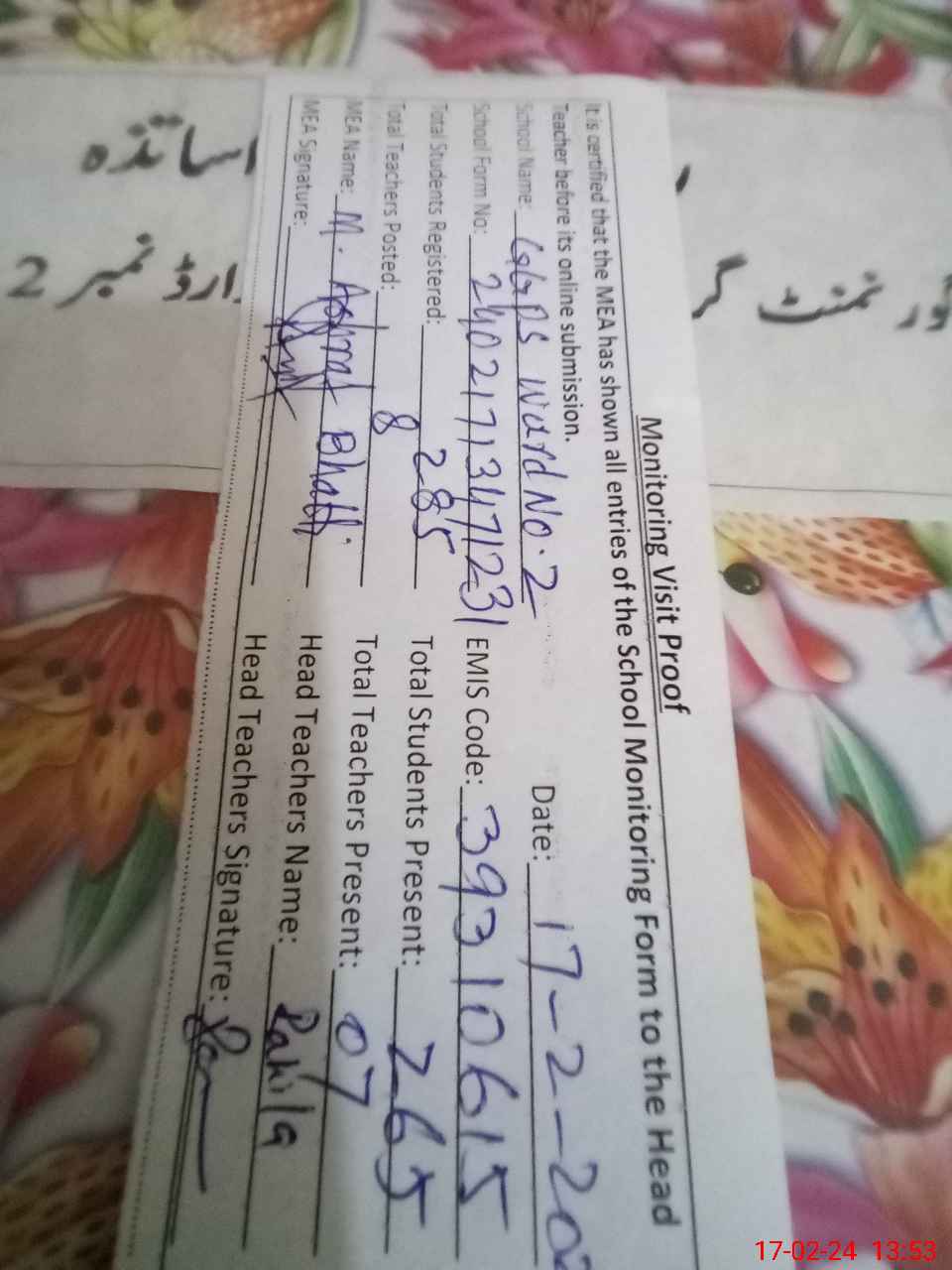 | Attendance Register | Head Teacher | MEA with School | Visit Proof |