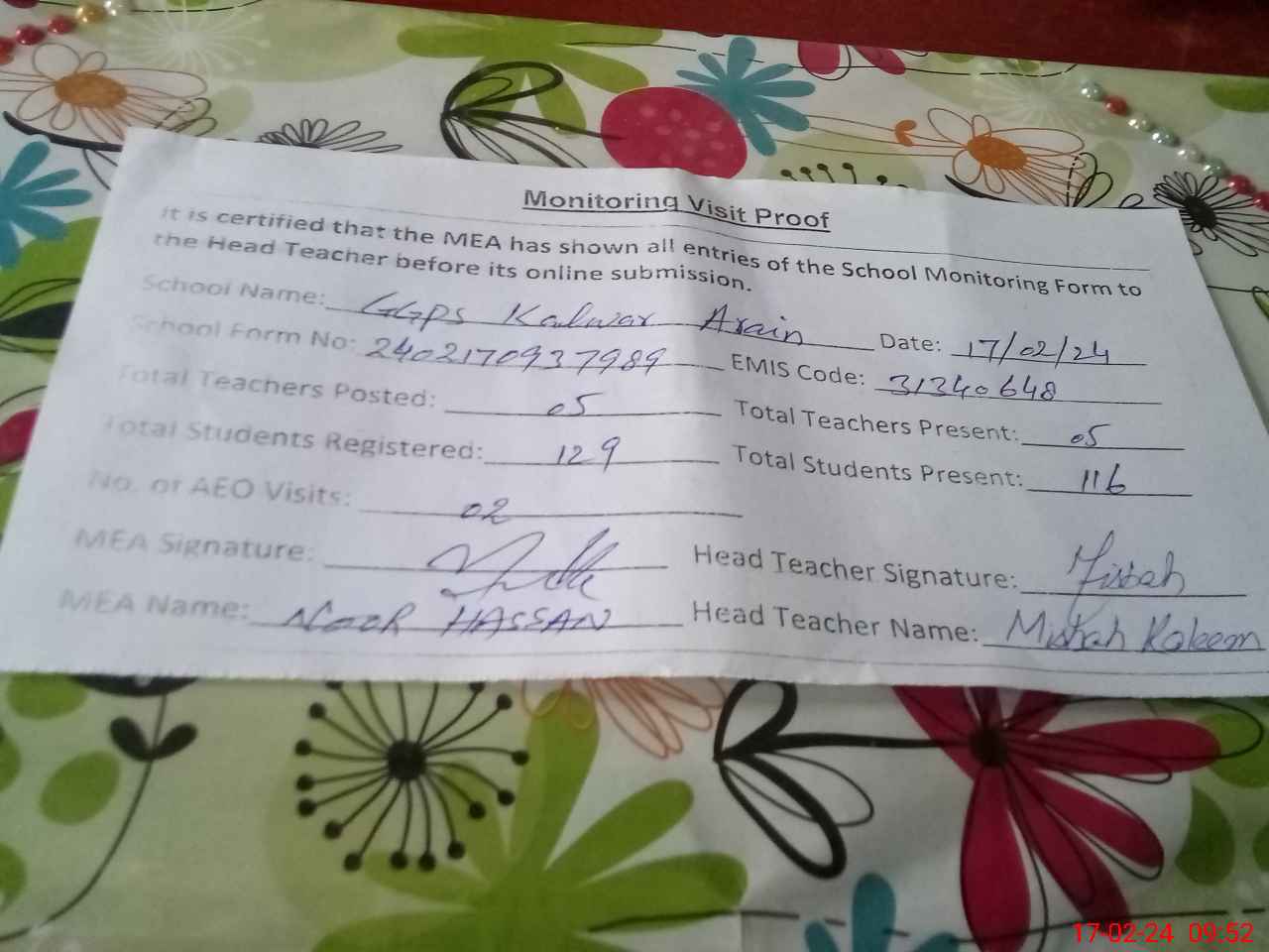 | EMIS Code: 31340648 | Name of School: GGPS KALWARA ARAIN | |||