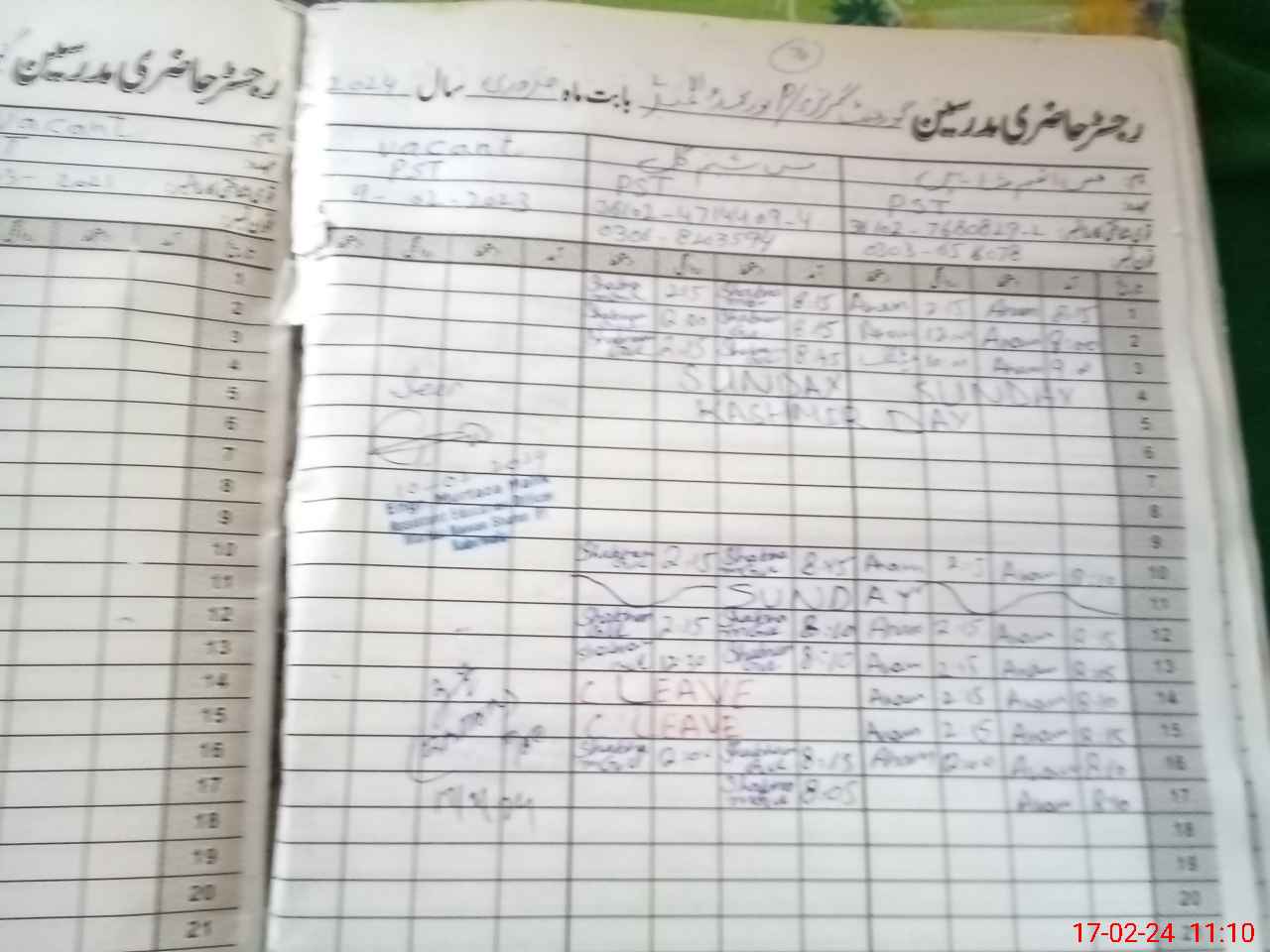 | CNIC | Full Name | Designation | R/C | Absence During Last Calender Month |