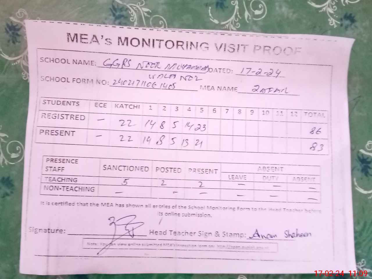 | Attendance Register | Head Teacher | MEA with School | Visit Proof |